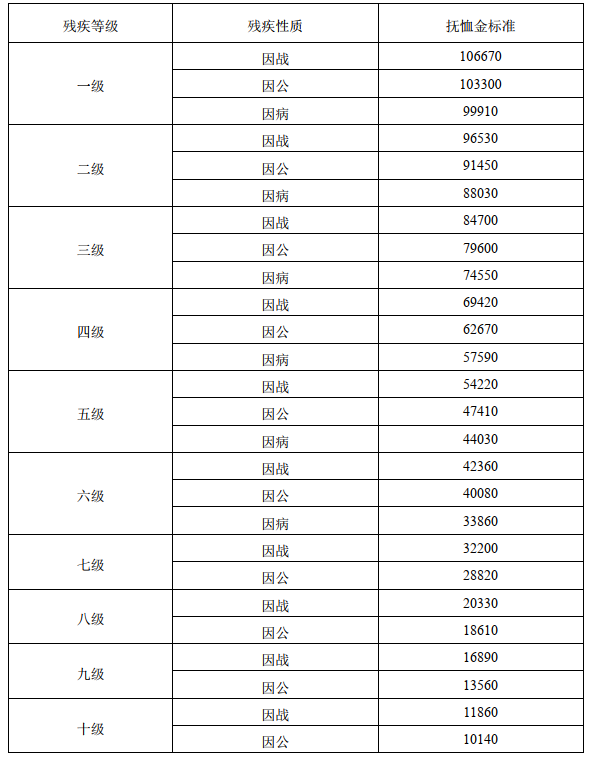 殘疾軍人、傷殘人民警察、傷殘國家機關工作人員傷殘民兵民工殘疾撫恤金標準表