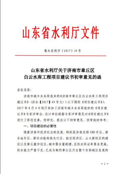 2017年9月6日,山東省水利廳以“魯水發規字[2017]34號”向山東省發展和改革委員會出具了關于白云水庫工程項目建議書初審意見的函。