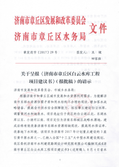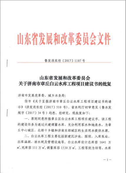 2017年9月25日,山東省發展和改革委員會以“魯發改農經[2017]1107號”下達了《關于濟南市章丘白云水庫項目建議書的批復》。