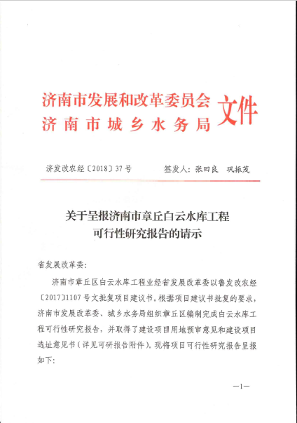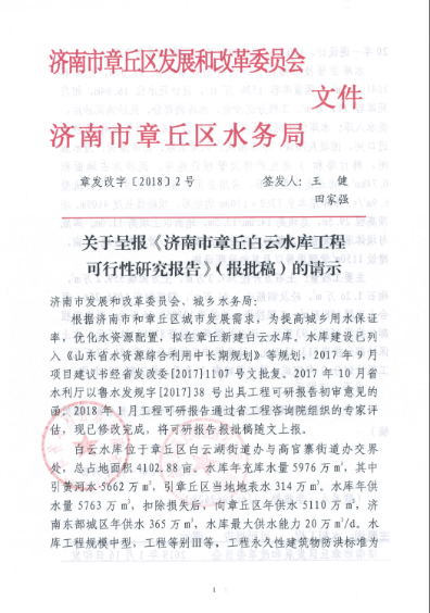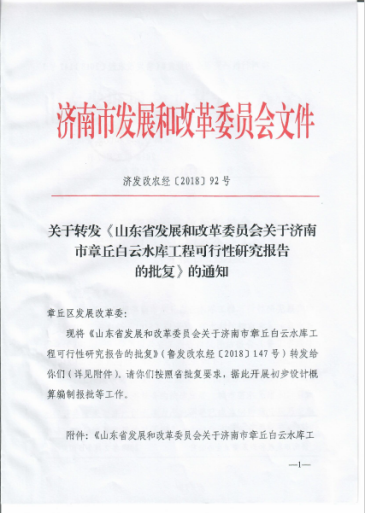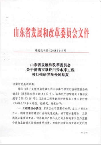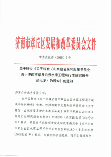 2018年1月31日,山東省發展和改革委員會以“魯發改農經[2018]147號”文,對工程可行性研究報告進行了批復;2018年2月7日濟南市發展和改革委員會、2018年2月11日濟南市章丘區發展和改革委員會對批復文件進行轉發。