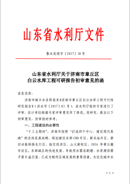 2017年10月17日,山東省水利廳以“魯水發規字[2017]38號”出具了工程可研報告初審意見的函。