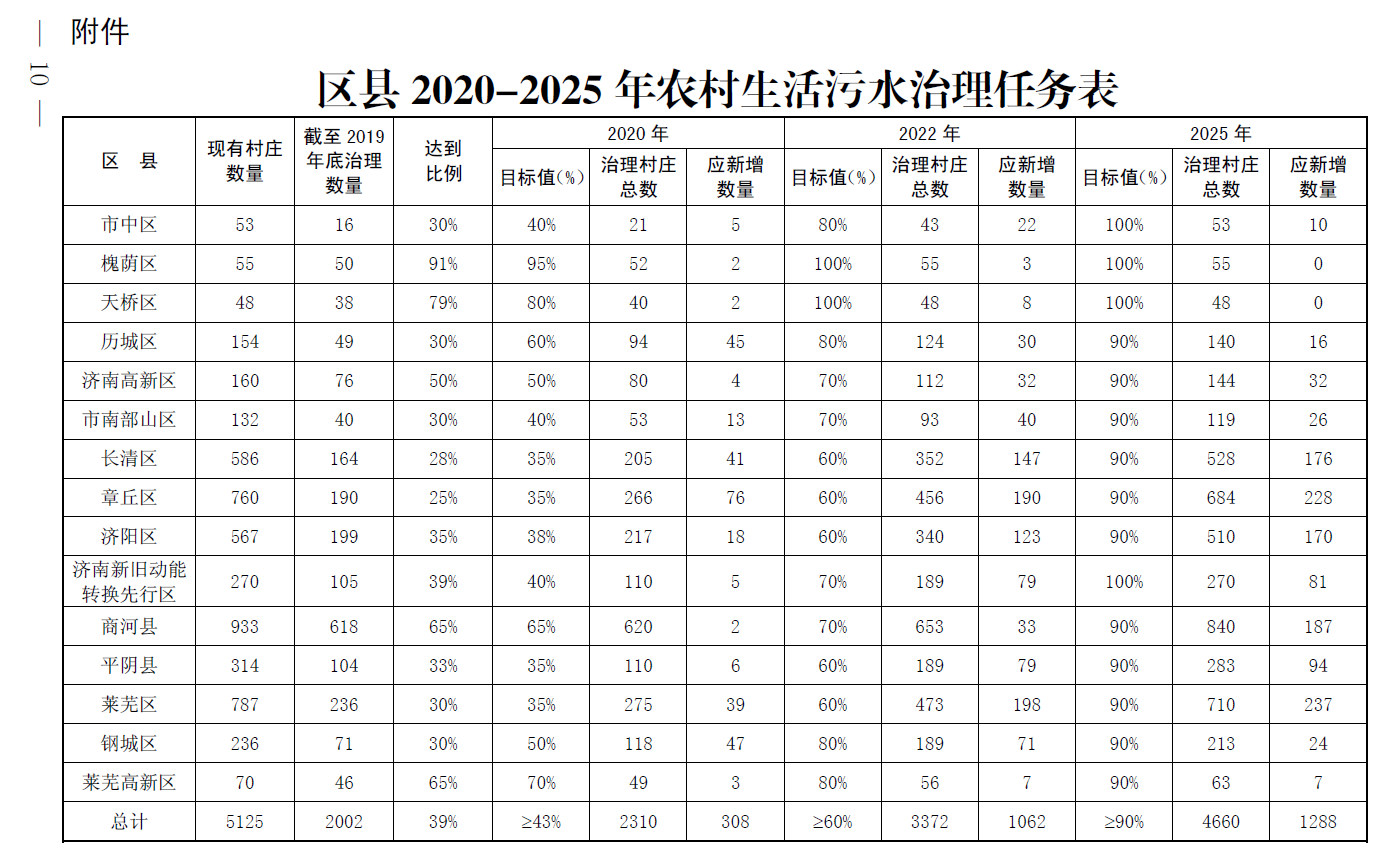 以打造鄉村振興齊魯樣板為抓手,以農村人居環境整治、美麗鄉村建設為載體,按照“統籌規劃、梯次推進,政府推動、多元投入,部門協同、合力攻堅,建管并重、科學運維”的工作原則,生態為本,注重實效,適度超前,打造亮點,對全市涉農鎮(街道)及所屬行政村、新型農村社區實施生活污水治理。2020年年底前,全市43%以上的行政村完成生活污水治理任務,村莊內污水橫流、亂排亂倒情況基本消除,運維管護機制基本建立;2022年年底前,全市60%以上的行政村完成生活污水治理任務;2025年年底前,全市90%以上的行政村完成生活污水治理任務。