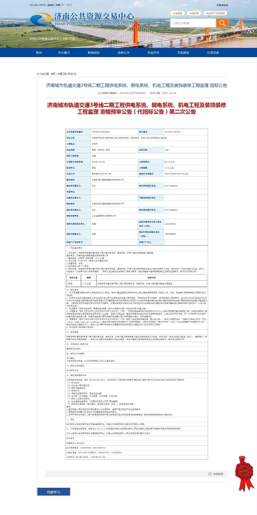 濟南軌道交通3號線二期工程供電系統、機電安裝及裝飾裝修工程監理招標公告