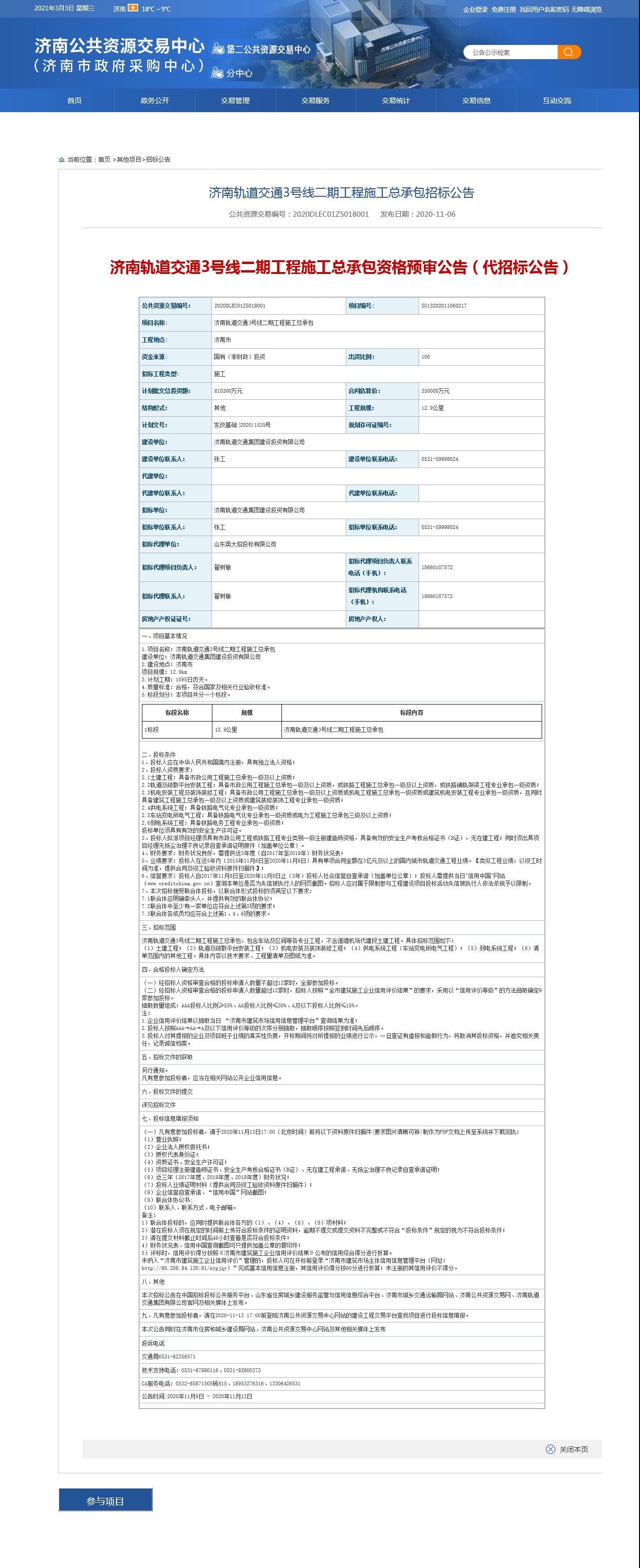 濟南軌道交通3號線二期工程施工總承包招標公告