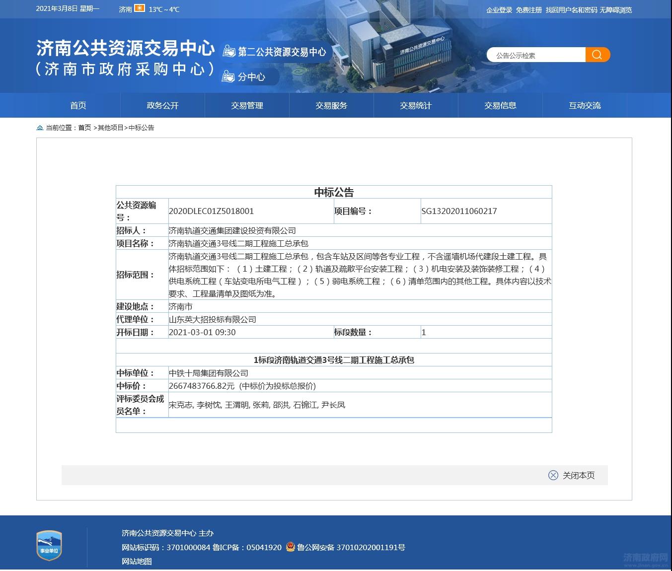 濟(jì)南軌道交通3號(hào)線二期工程施工總承包中標(biāo)公告