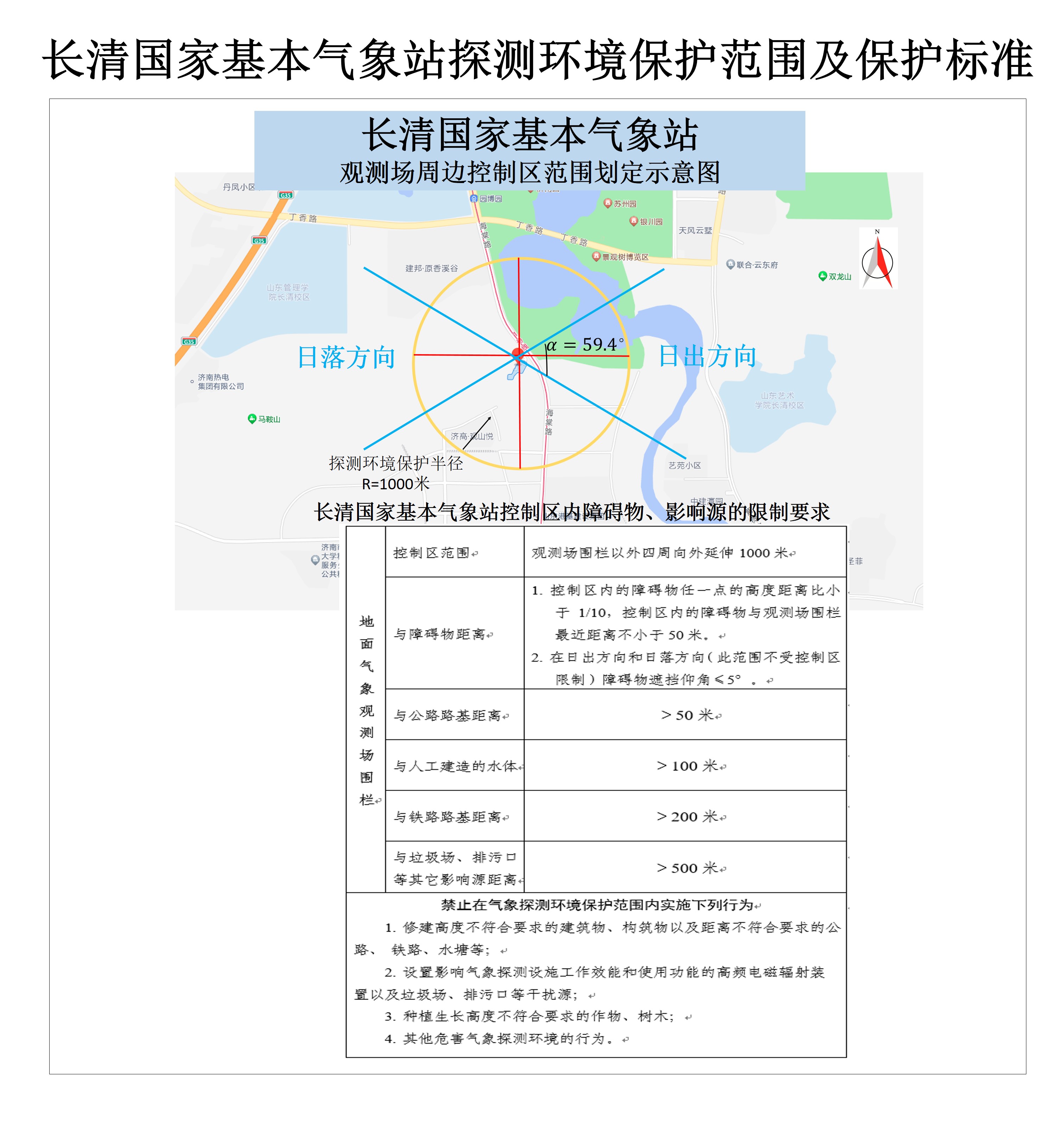 氣象探測環境保護范圍為長清國家基本氣象站觀測場圍欄以外四周向外延伸的距離為1000米。