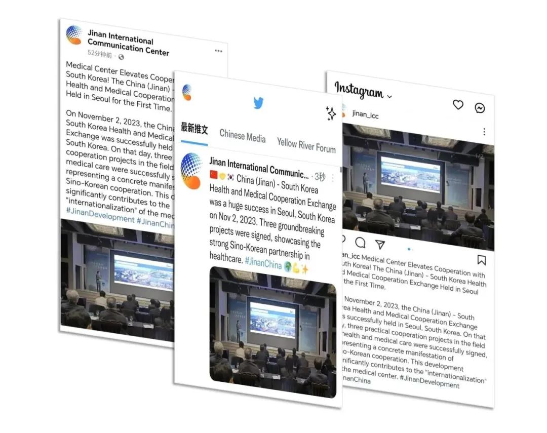 同時,濟南國際傳播中心在Facebook、Instagram、Twitter等海外主流平臺對合作交流會進行了宣傳、發(fā)布,濟南國際醫(yī)學中心成功“出圈”海外,國際影響力和知名度不斷提升。