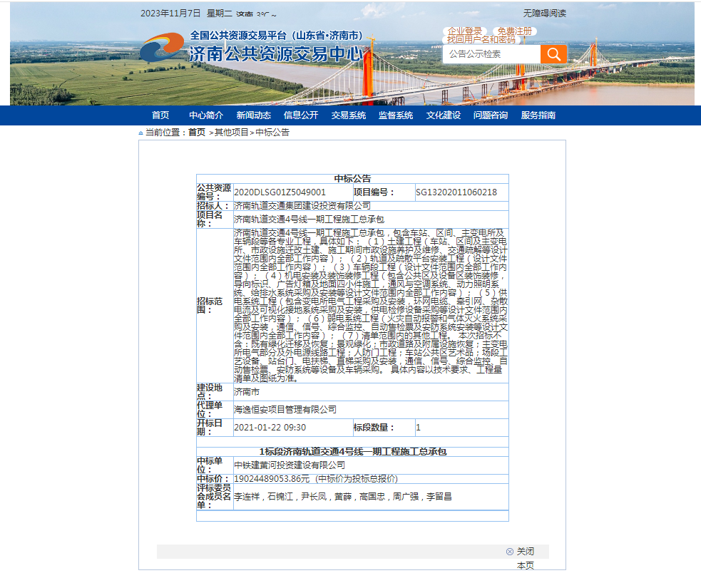 【批準結果信息】濟南軌道交通4號線一期工程項目中標人公示