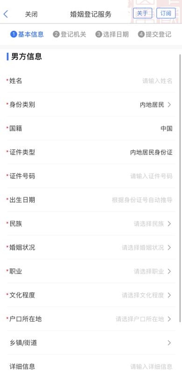 3、根據(jù)頁面提示填寫男方、女方信息,就近選擇登記機(jī)關(guān)、預(yù)約日期及時段,上傳相關(guān)附件,確認(rèn)信息提交即可;