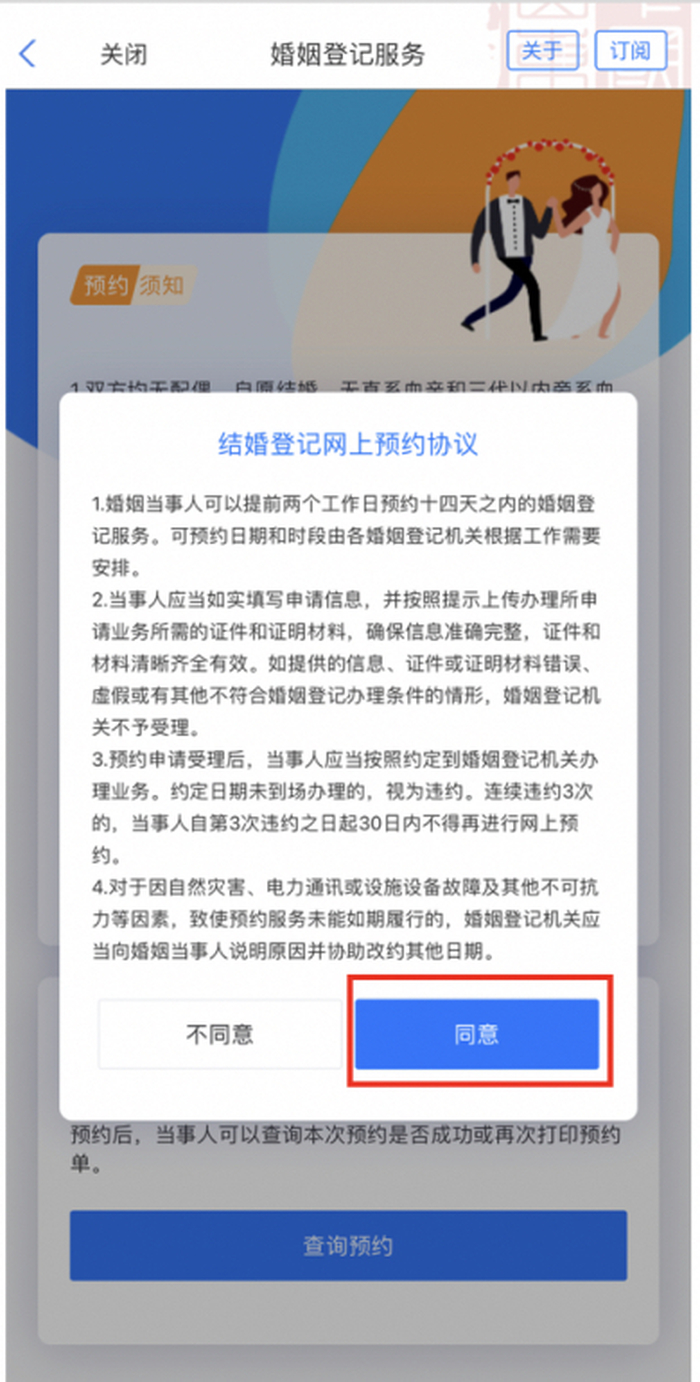 2、選擇“結(jié)婚登記預(yù)約”,閱讀預(yù)約須知并點擊“我要預(yù)約”,同意結(jié)婚登記網(wǎng)上預(yù)約協(xié)議后,即可進(jìn)入預(yù)約流程;