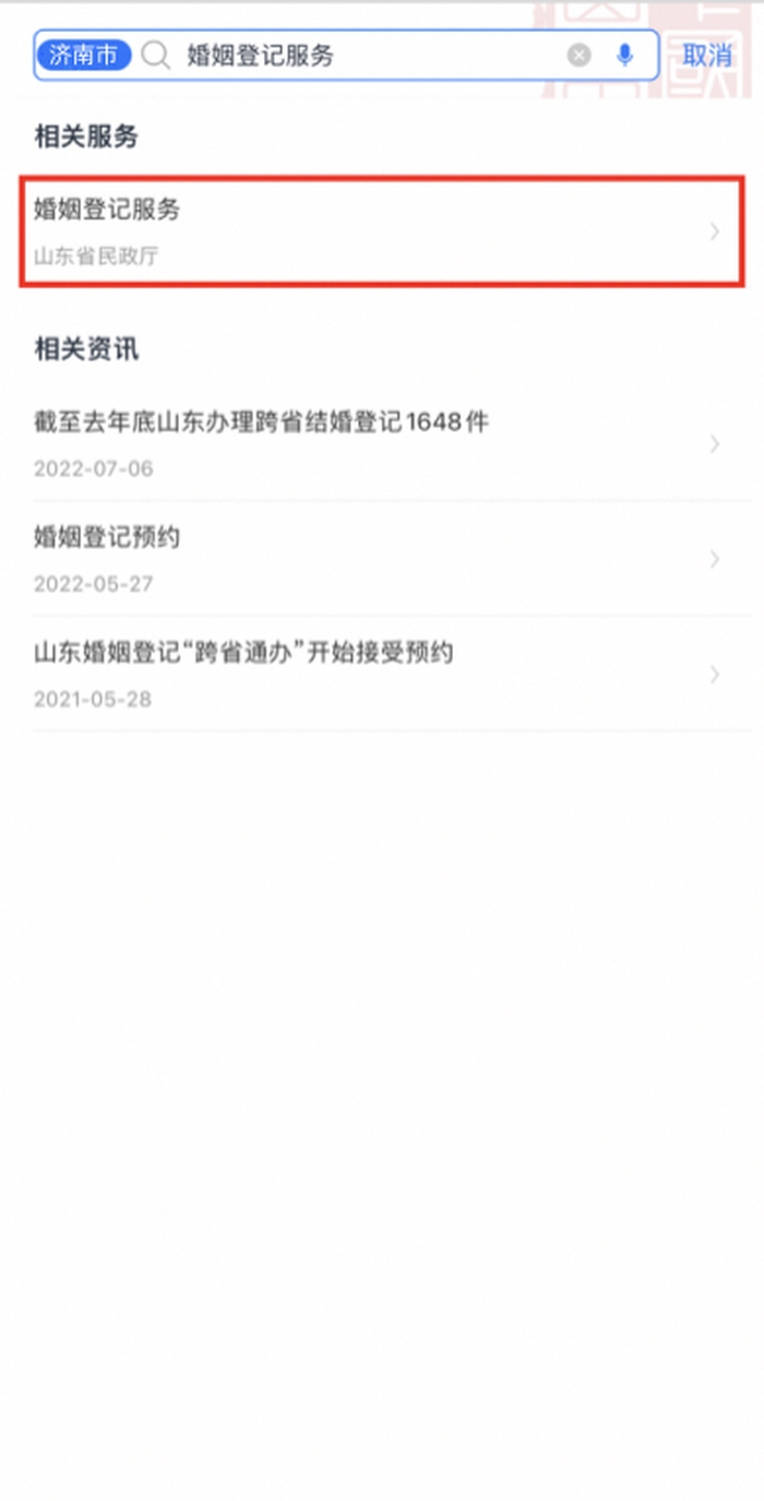 1、進(jìn)入“愛山東”濟(jì)南分廳,首頁搜索“婚姻登記服務(wù)”,點擊進(jìn)入。