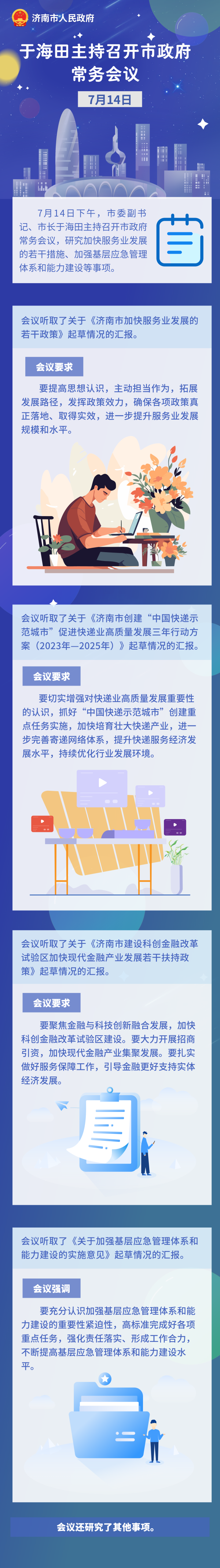 7月14日下午,市委副書記、市長于海田主持召開市政府常務會議,研究加快服務業(yè)發(fā)展的若干措施、加強基層應急管理體系和能力建設(shè)等事項。