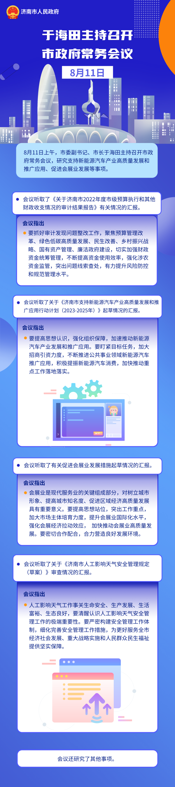 8月11日上午,市委副書(shū)記、市長(zhǎng)于海田主持召開(kāi)市政府常務(wù)會(huì)議,研究支持新能源汽車(chē)產(chǎn)業(yè)高質(zhì)量發(fā)展和推廣應(yīng)用、促進(jìn)會(huì)展業(yè)發(fā)展等事項(xiàng)。
