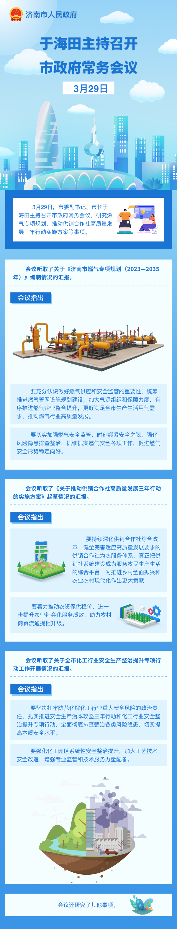 3月29日,市委副書記、市長(zhǎng)于海田主持召開市政府常務(wù)會(huì)議,研究燃?xì)鈱m?xiàng)規(guī)劃、推動(dòng)供銷合作社高質(zhì)量發(fā)展三年行動(dòng)實(shí)施方案等事項(xiàng)。