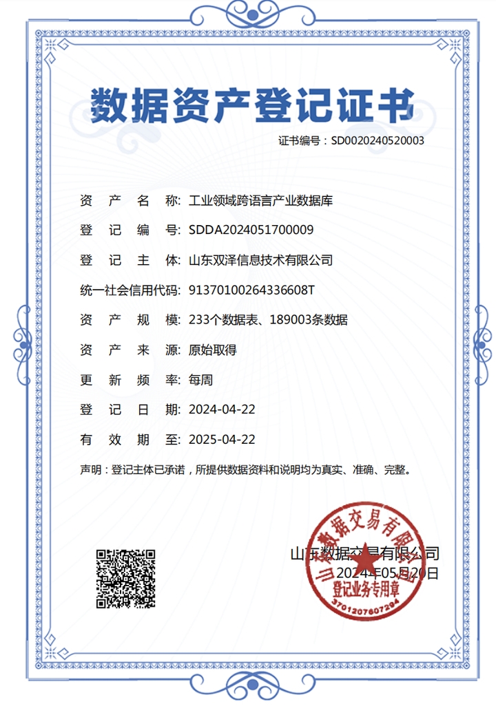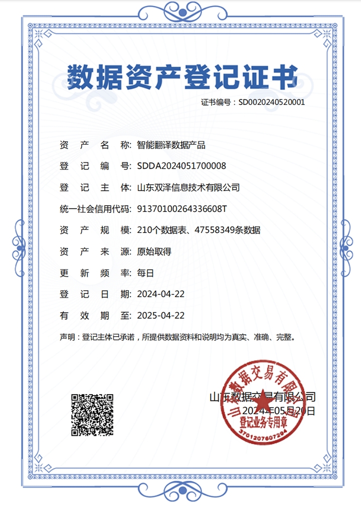 近日,在濟南市大數據局、中國(山東)自貿試驗區濟南片區指導下,山東產權交易集團旗下山東數據交易有限公司(以下簡稱山東數據)助力山東雙澤信息技術有限公司成功完成數據資產入賬入表工作。此次數據資產入賬入表,涉及標準關聯條款數據產品、工業領域跨語言產業數據庫、智能翻譯數據產品三個數據資產,是山東省首單跨境數據資產的實踐案例,標志著山東跨境數據資產管理和價值化進程加速。