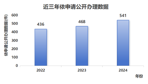 強化服務理念,主動與申請人溝通,做好便民解答、指引和服務,推動申請人合理訴求的實質性解決。開發建設“全市政府信息依申請公開智能化辦理系統”,實現對全市政府信息依申請公開件接收、登記、補正、辦理、協查、審簽、答復、延期、歸檔等全流程監管和全閉環管理,系統具備大數據分析、熱力圖展示、案例庫共享等功能。全年共受理公眾向市政府(市政府辦公廳)提交的政府信息公開申請543件(含上年度結轉6件),申請內容主要集中在城市更新、征收拆遷、土地出讓、城鄉規劃等方面,依法辦結541件,結轉下年度辦理2件。