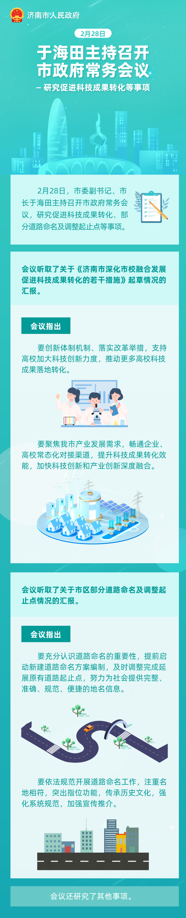 2月28日,市委副書記、市長(zhǎng)于海田主持召開市政府常務(wù)會(huì)議,研究促進(jìn)科技成果轉(zhuǎn)化、部分道路命名及調(diào)整起止點(diǎn)等事項(xiàng)。