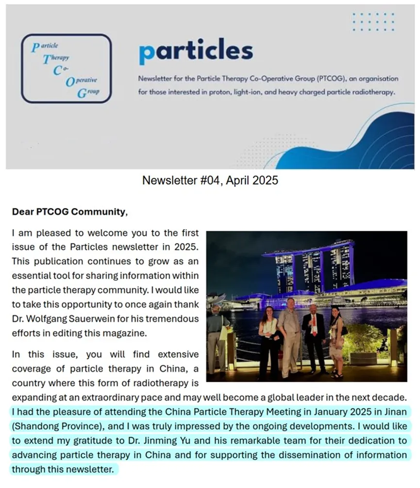 開篇詞中,PTCOG現(xiàn)任主席Marco Durante對(duì)我國粒子放療領(lǐng)域迅速發(fā)展表示驚嘆,認(rèn)為“中國很可能在未來十年成為粒子放療的全球領(lǐng)導(dǎo)者”(In this issue, you will find extensive coverage of particle therapy in China, a country where this form of radiotherapy is expanding at an extraordinary pace and may well become a global leader in the next decade.)。同時(shí),Durante主席表達(dá)了受于金明院士邀請(qǐng),于今年年初參加在濟(jì)南舉辦的“中國粒子放療大會(huì)”的感謝,認(rèn)為我院粒子放療事業(yè)的發(fā)展、布局給他留下了深刻的印象,并感謝于金明院士團(tuán)隊(duì)對(duì)中國粒子治療事業(yè)的發(fā)展所付出的努力,及對(duì)本期通訊稿的支持(I had the pleasure of attending the China Particle Therapy Meeting in January 2025 in Jinan (Shandong Province), and I was truly impressed by the ongoing developments. I would like to extend my gratitude to Dr.Jinming Yu and his remarkable team for their dedication to advancing particle therapy in China and for supporting the dissemination of information through this newsletter.)。
