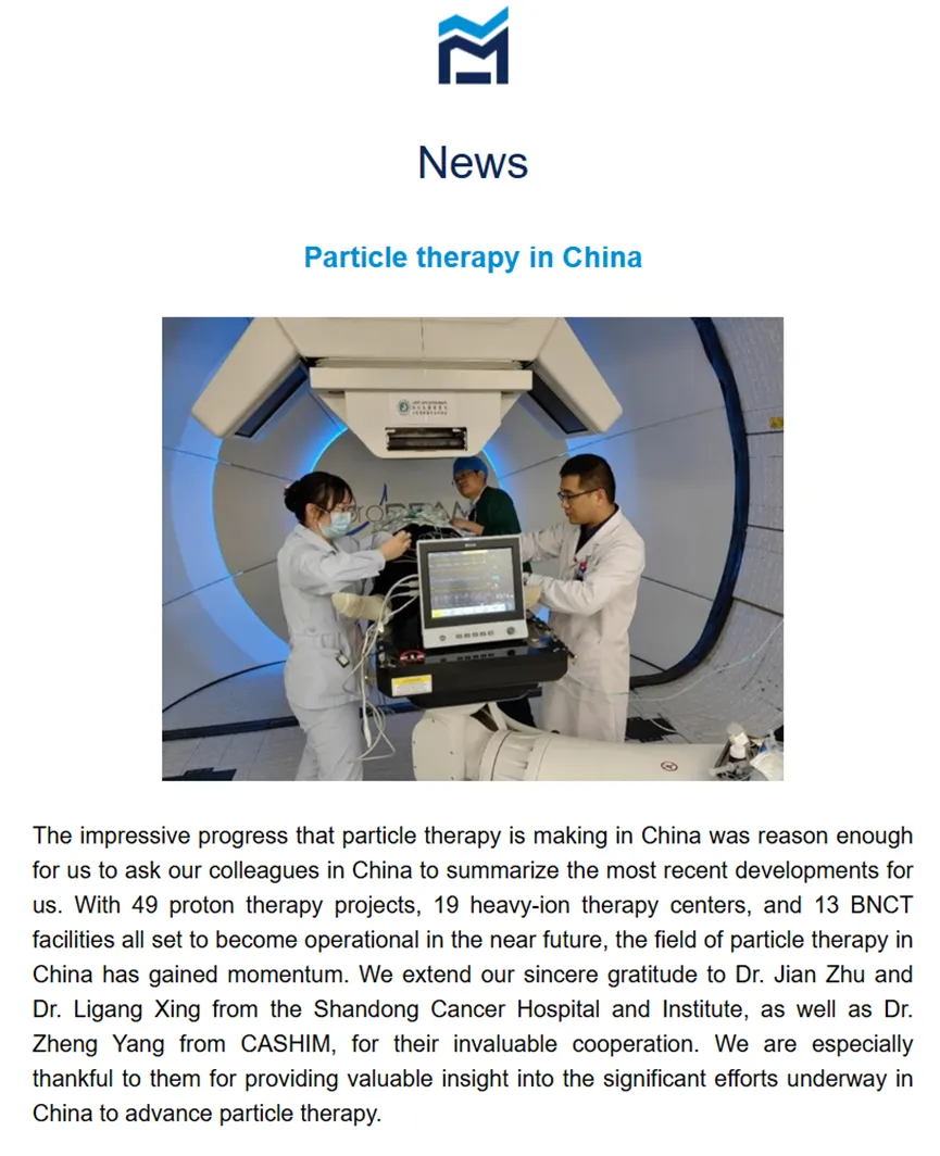 4月初,國際粒子治療協(xié)作組PTCOG(Particle Therapy Co-Operative Group)發(fā)布《粒子通訊》(英文名《Particles》)2025年第一期通訊稿,對(duì)山東第一醫(yī)科大學(xué)附屬腫瘤醫(yī)院在中國工程院院士、院長于金明帶領(lǐng)下,開展質(zhì)子放療現(xiàn)狀以及布局重離子、硼中子俘獲治療項(xiàng)目的情況作了專題大篇幅報(bào)道。