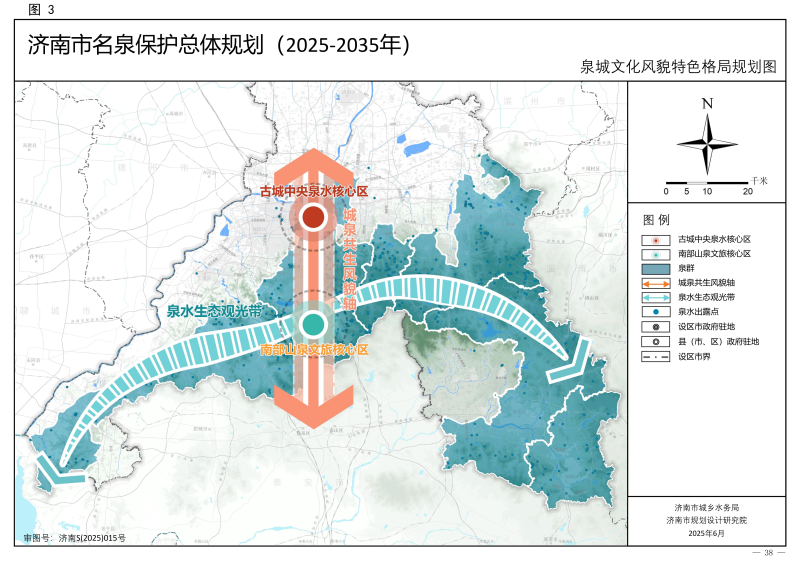 一軸:城泉共生風(fēng)貌軸,依托山水圣人文化軸,聚焦泉城特色,串聯(lián)重要泉水聚集區(qū),融匯山、泉、湖、河、城多元景觀,集中彰顯濟(jì)南城泉共生的特色風(fēng)貌與泉水文化。