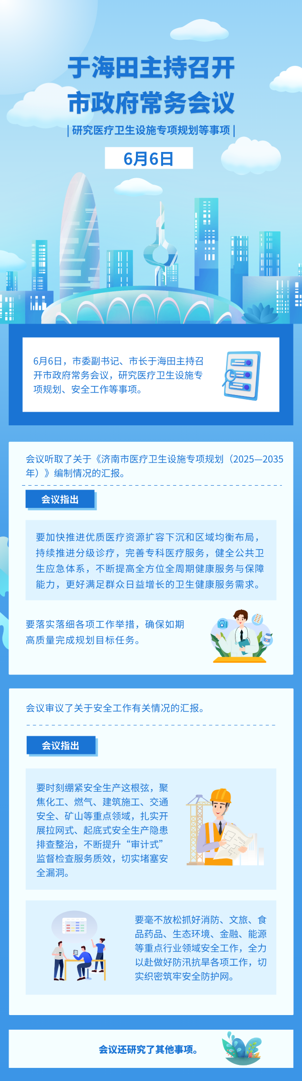 6月6日,市委副書記、市長于海田主持召開市政府常務會議,研究醫(yī)療衛(wèi)生設施專項規(guī)劃、安全工作等事項。
