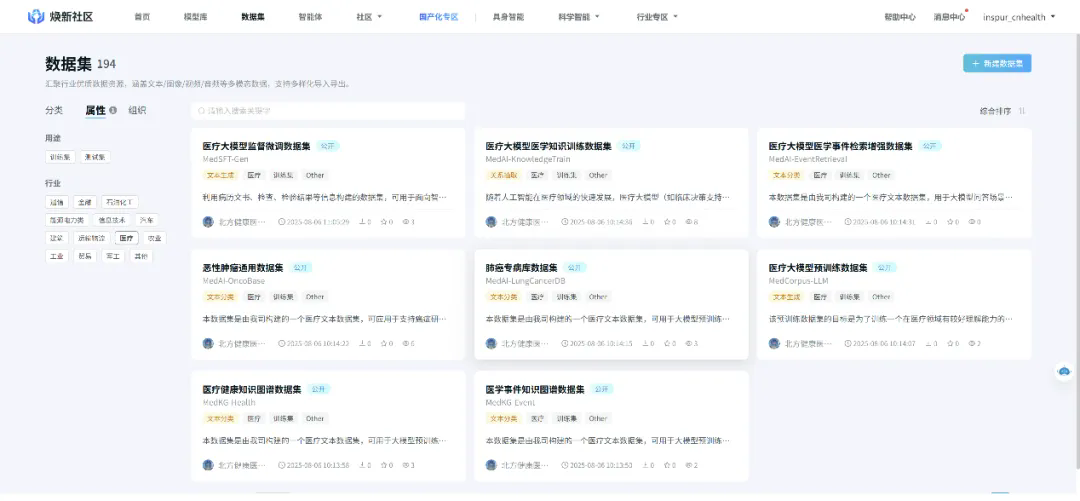 作為濟南國際醫學中心引入的國家級平臺——國家健康醫療大數據中心(北方)的授權運營企業,同時也是我國醫療大數據領域的首家國家級專精特新“小巨人”企業,北方健康積極響應國家號召,快速入駐“煥新社區”并開放首批自主知識產權醫療行業數據集和模型庫,助力產業鏈更加便捷地開發和使用國產醫療AI能力。