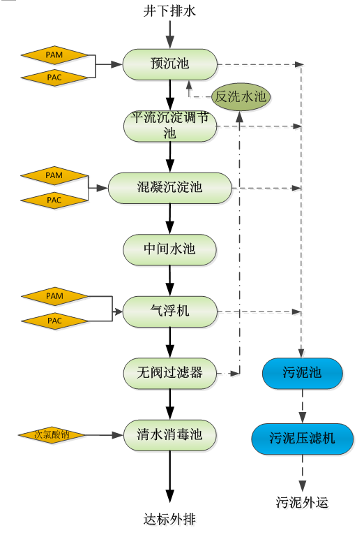 工 藝:預沉池+平流沉淀調(diào)節(jié)池+混凝沉淀池+中間水池+無閥過濾器+清水消毒池